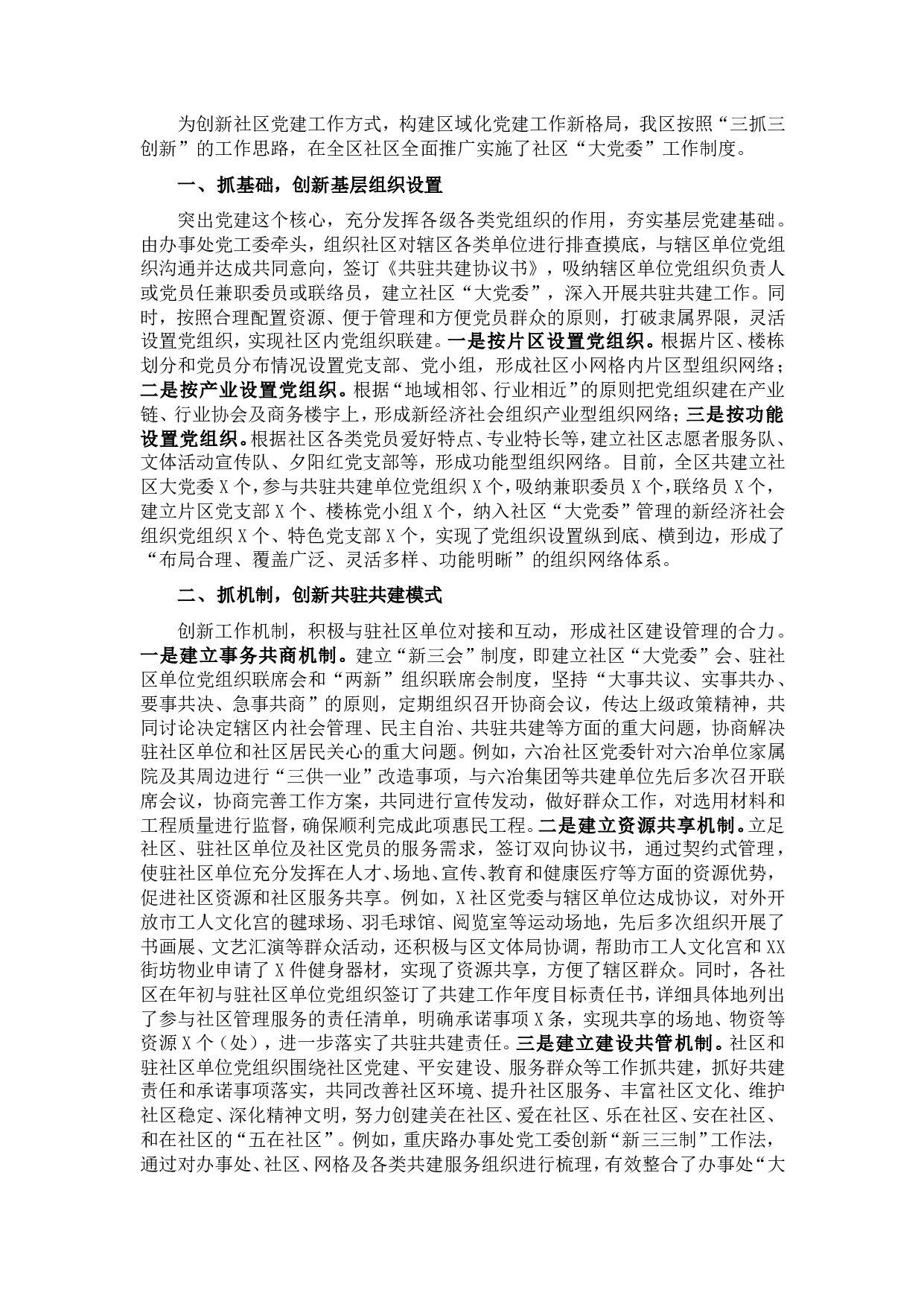 “三抓三创新”深入推进社区“大党委”建设——基层党建交流发言材料